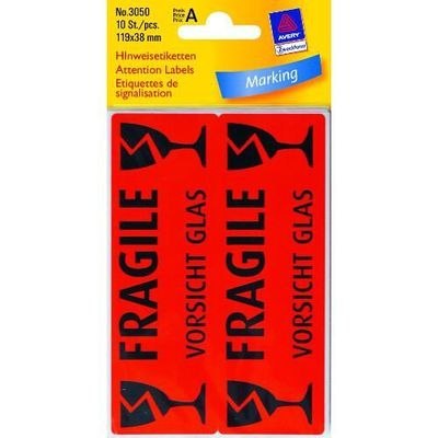 Etykiety informacyjne UWAGA SZKŁO, 10 etyk./op., 119 x 38 mm, czerwony odblaskowy, AVERY ZWECKFORM, 3050