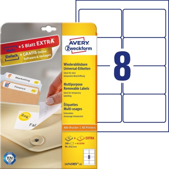 | Nazwa B2B | Usuwalne Etykiety AVERY ZWECKFORM uniwersalne A4, 25 ark./op., 96 x 63,5 mm, białe |