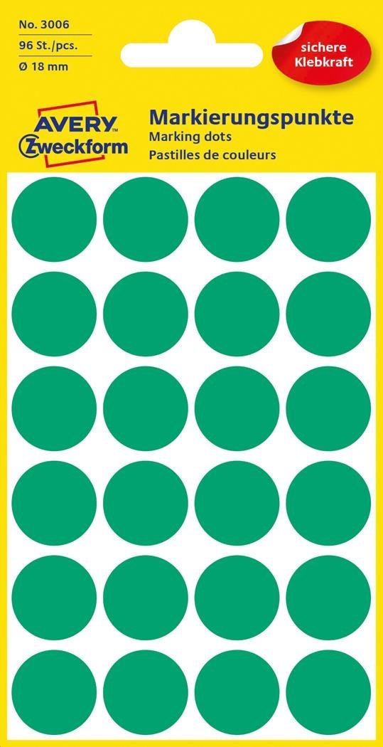 | Nazwa B2B | Trwałe kółka do zaznaczania _18mm, 96szt./op. Zielone 3006 Avery Zweckform |
