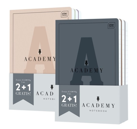 Zestaw 3 zeszytów w formacie A5 (2+1gratis). Liczba kartek: 60. Zadruk w linię. Zaokrąglone rogi. Elegancka strona adresowa. W środku grube i super gładkie kartki ze specjalnego papieru 90 g, dzięki którym długopis nie przebije na drugą stronę. Okładka zabezpieczona mocnym lakierem hybrydowym, który lepiej chroni przed zniszczeniem. Academy to kolekcja papiernicza premium stworzona z myślą o uczniach i studentach, ceniących sobie jakość produktu i komfort pisania.